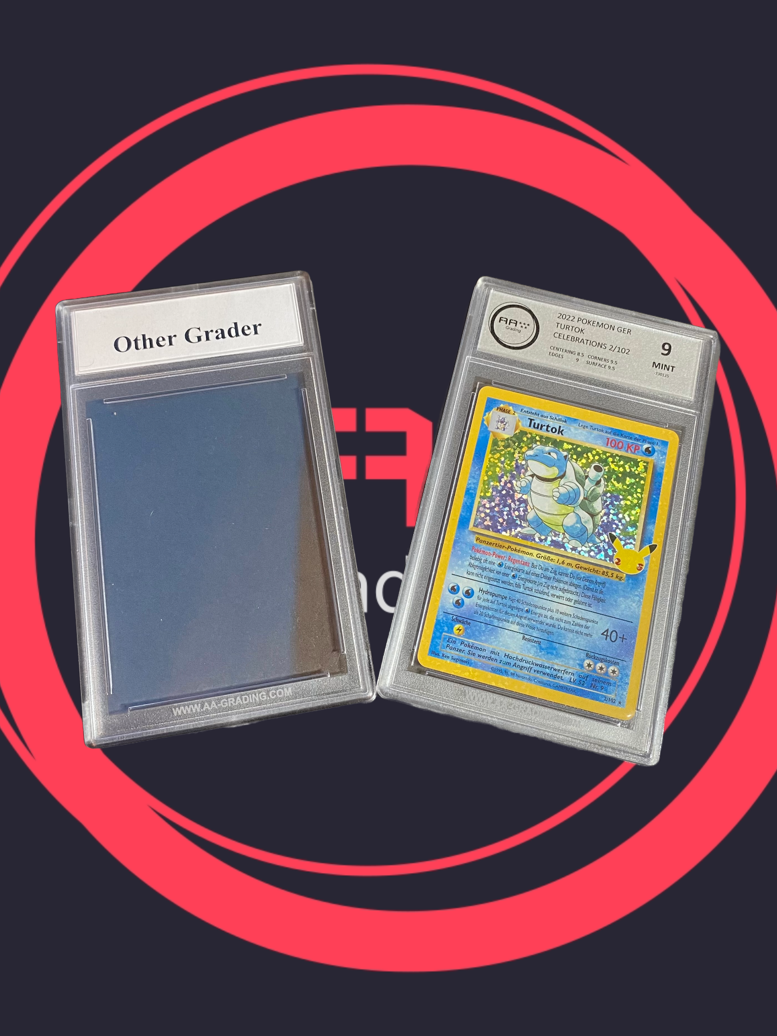 Die Karte wird zunächst im Case des vorherigen Anbieters vorab im verschlossenen Case bewertet. Sollte die Note durch AA-Grading niedriger als die des vorherigen Anbieters sein, besteht die Möglichkeit des Verbleib der Karte im Case des vorherigen Anbieters. In diesem Falle wird ein Betrag von 9,95€ berechnet anstelle des Betrags von 18,95€